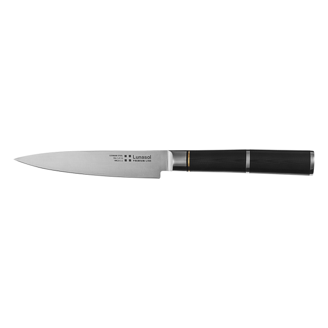 • Prémiový nůž Lunasol s kovanou čepelí je určen k řezání. Čepel nože je vyrobena z německé oceli a díky delší čepeli (20 cm) je vhodná zejména na krájení vařeného a pečeného masa. Nůž je vhodný do průmyslové myčky.