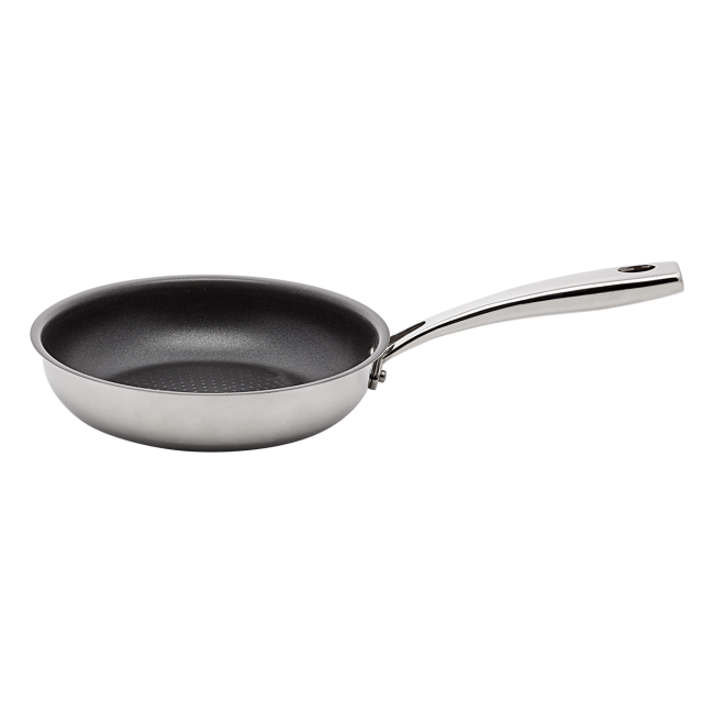 Kvalitní třívrstvá pánev z řady Premium Line je vyrobena z chromniklové oceli 18/10. Interiér je pokryt švýcarským nepřilnavým povrchem DURIT by ILAG s měděným páskem, který umožňuje přípravu jídel s minimálním použitím oleje, tuku nebo másla. Pánev má průměr 240 mm a hloubku 46 mm. Má feromagnetické dno a je proto vhodný pro všechny typy varných desek...