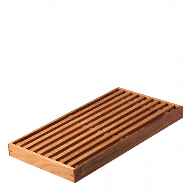 Praktická deska na krájení chleba nebo pečiva se skládá ze dvou částí. Odnímatelná mřížka a spodní nádoba na drobky. Když na něj nakrájíte něco, co drobky, drobky spadnou do nádoby a neskončí na pracovní desce ani na zemi. Výrobek je vyroben z tvrdého teakového dřeva, které se vyznačuje vysokou odolností proti vlhkosti.