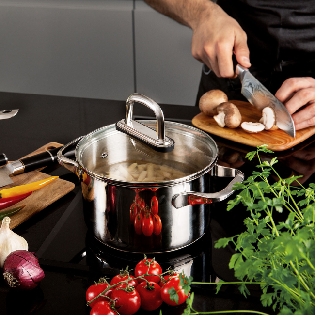 Pánev Saturn vyniká především díky unikátní technologii vnitřní povrchové úpravy. Je to ILAG XERADUR 2 s kovovým efektem, který je vysoce odolný proti oděru a korozi. Zkouška adheze prokázala, že vejce neshořela ani při teplotě 300 °C. Řada Saturn je navržena v nadčasovém designu s velkými praktickými rukojeťmi, vhodnými pro všechny typy varných desek, z...