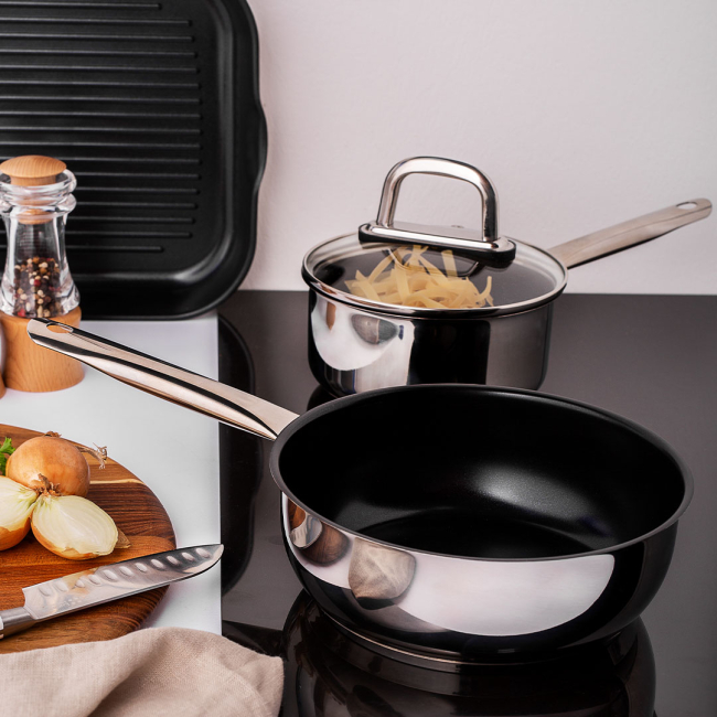 • Pánev Saturn vyniká především díky unikátní technologii vnitřní povrchové úpravy. Je to ILAG XERADUR 2 s kovovým efektem, který je vysoce odolný proti oděru a korozi. Zkouška adheze prokázala, že vejce neshořela ani při teplotě 300 °C. Řada Saturn je navržena v nadčasovém designu s velkými praktickými rukojeťmi, vhodnými pro všechny typy varných desek, z...