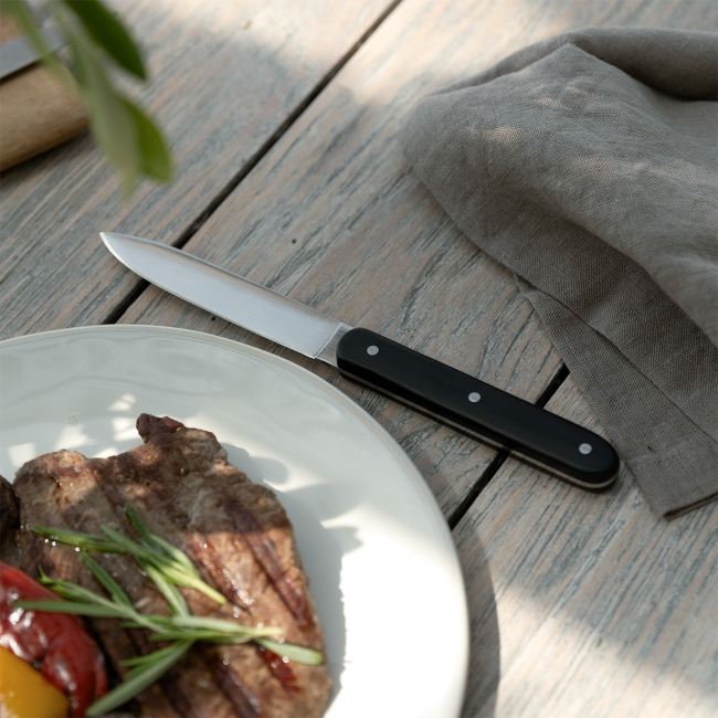 Prémiový nůž s kovanou čepelí a bílou rukojetí je určen pro řezání a krájení steaků. Čepel nože (11,4 cm) je vyrobena z kvalitní německé oceli a zvládne jakýkoliv druh steaku. Nůž je vhodný do průmyslové myčky.