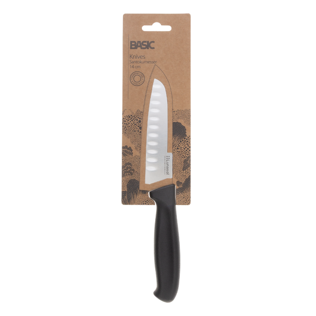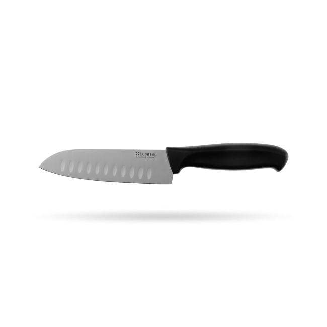 Prémiový nůž santoku Lunasol s kovanou čepelí je všestranný. Čepel nože je vyrobena z německé oceli (17,8 cm). Nůž je vhodný do průmyslové myčky.
