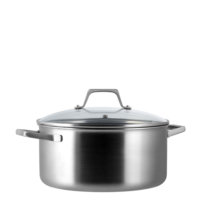 Hrnec je vhodný pro všechny typy sporáků, včetně indukce. Průhledná skleněná poklice umožňuje kontrolu varu bez ztráty tepla a páry, čímž zvyšuje efektivitu a šetří energii během vaření.