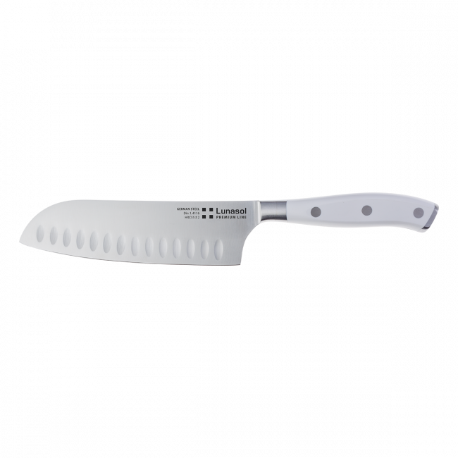 Prémiový nůž Santoku s kovanou čepelí a bílou rukojetí má všestranné využití například pro krájení zeleniny, ryb nebo masa. Čepel (12,7 cm) je vyrobena z kvalitní německé oceli. Nůž je vhodný do průmyslové myčky.