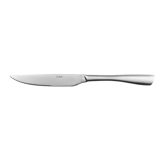 Stolní nůž z nerezové oceli s čistými liniemi a moderním vzhledem. Rukojeť je tvarovaná a doplněná jemným reliéfním detailem, který zvýrazňuje design a zároveň zajišťuje příjemný, stabilní úchop. Vhodný pro stylové každodenní stolování i reprezentativní prostírání.