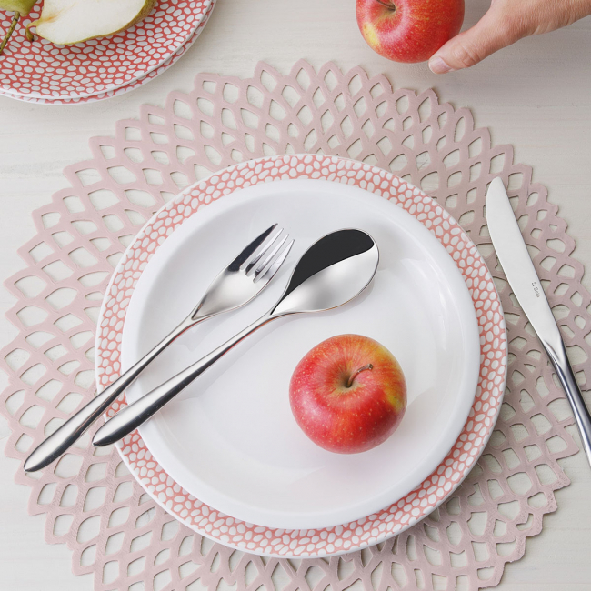 Vzhledem k odolnosti čepele je dezertní nůž Valencia vyroben z chromové oceli 18/0 v lesklém vzhledu. Rukojeť nože má konec ve tvaru slzy. Dezertní nůž Valencia je vhodný i do průmyslové myčky. Doživotní záruka dokoupení.