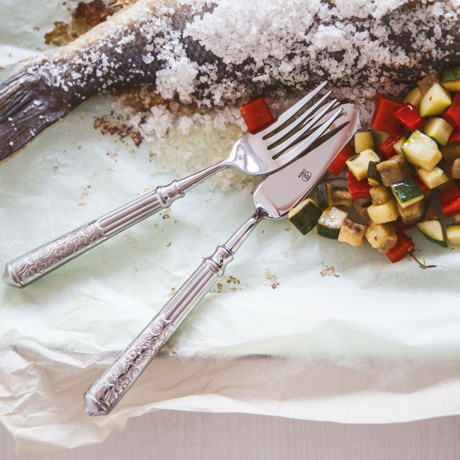 • Rybí nůž s dutou rukojetí San Remo z řady Platinum line je vyroben z vysoce kvalitní chromniklové oceli 18/10. Rukojeť je z poloviny zdobena květinovým vzorem a z poloviny drážkami. Nůž na ryby San Remo je vhodný do průmyslové myčky nádobí.