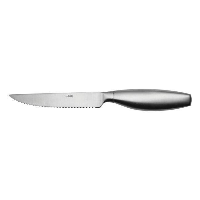 Moderní steakový nůž Touch me v celomatném provedení je vyroben z chromové oceli 18/0. Nůž má dutou ergonomicky tvarovanou rukojeť se 130 mm dlouhou čepelí s vroubkováním po celé délce. Je vhodný do průmyslové myčky.
