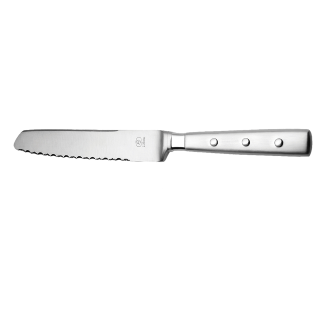 Nůž z řady Bistro v matném vzhledu má čepel z chromové oceli 18/0 pro odolnost. Dutá rukojeť, která je vyrobena z chromniklové oceli 18/10, má imitaci nýtů ve vysokém lesku. Nůž Bistro je vhodný do průmyslové myčky.
