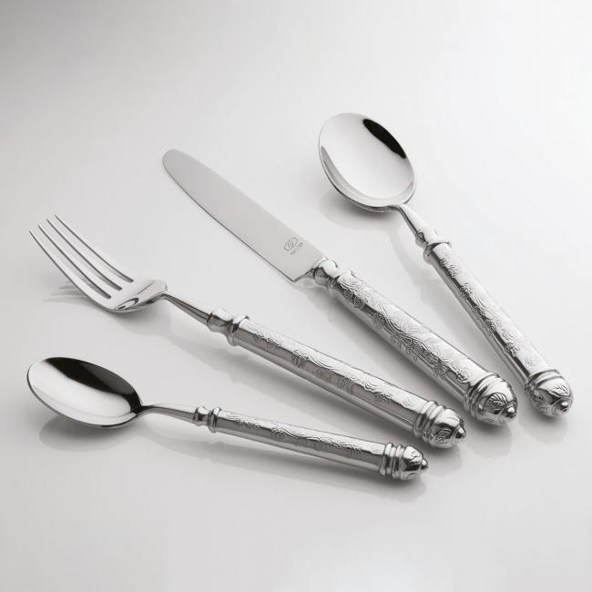 Lžíce s dutou rukojetí Santiago z řady Platinum line je vyrobena ručně z vysoce kvalitní chromniklové oceli 18/10. Rukojeť je zdobena květinovým vzorem, díky čemuž se skvěle hodí do interiérů s rustikálním vybavením. Je vhodný do průmyslové myčky.