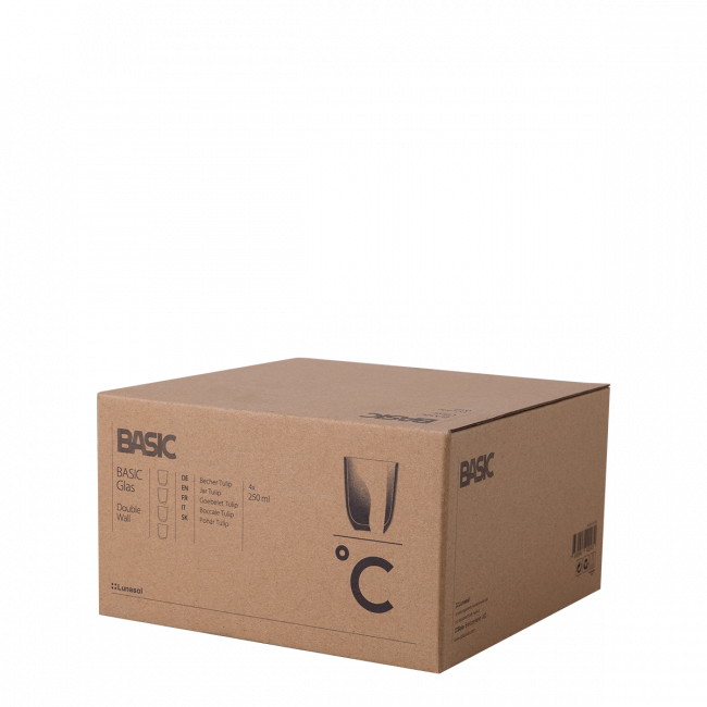 • Sada dvoustěnných kelímků Basic Glas byla vyrobena z borosilikátového skla v objemu 300 ml. Objem kelímku se počítá až k jeho okraji. Díky dvojité vrstvě skla udrží teplotu nápoje déle. Basic Glas cup je vhodný do průmyslové myčky. Teplotní odolnost: od – 20°C do + 150°C Upozornění – Nebezpečí popálení! Před použitím tohoto přípravku se vždy ujistěte, že...