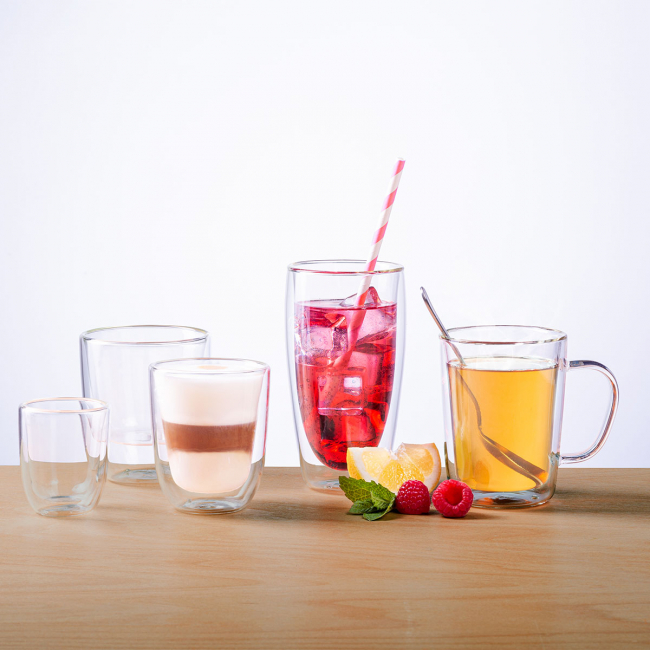 • Dvoustěnná sada kelímků Basic Glas byla vyrobena z borosilikátového skla v objemu 330 ml. Objem kelímků se počítá k jejich okraji. Díky dvojité vrstvě skla udrží teplotu nápoje déle. Basic Glas kelímky jsou vhodné do průmyslové myčky. Teplotní odolnost: od – 20°C do + 150°C Upozornění – Nebezpečí popálení! Před použitím tohoto přípravku se vždy ujistěte,...