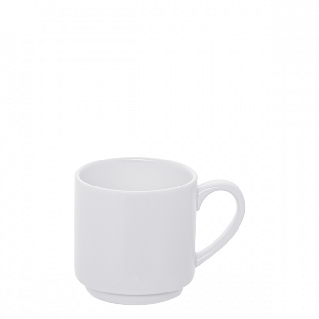 Bílý kelímek s uchem má kónický tvar a objem 300 ml. Jeho objem se počítá až po okraj. Šálek je vhodný do průmyslové myčky.