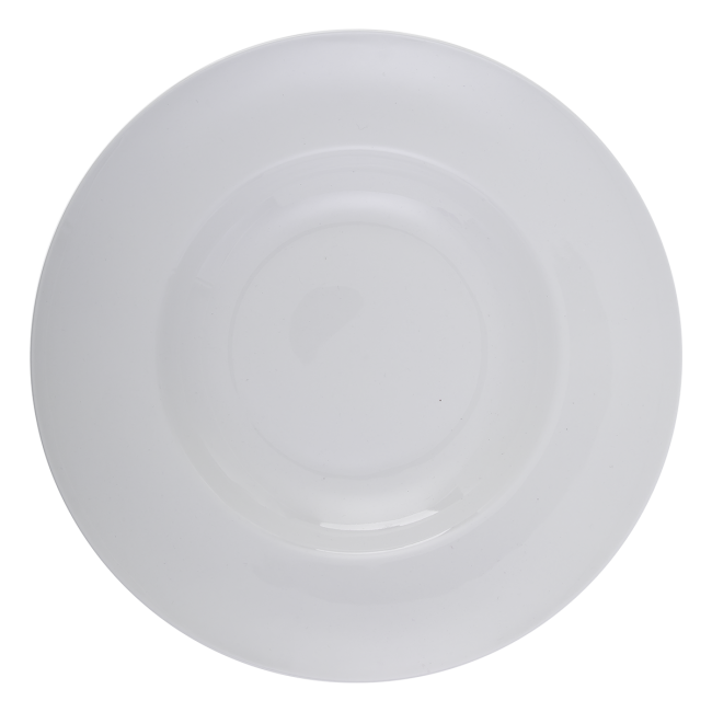 Bílý podšálek na kávu Lunasol má průměr 16 cm. Podšálek je stohovatelný a vhodný do průmyslové myčky.