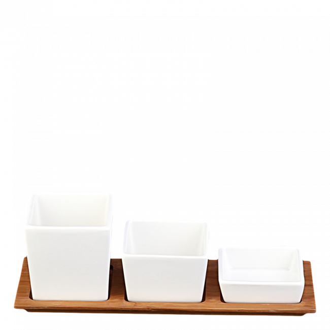 Sada čtvercových misek s bambusovým tácem z řady Basic Bamboo vyniká zajímavým moderním vzhledem. Efektní bílý super bílý porcelán je vyroben z kaolinu, křemene a živce. Uvedený objem odpovídá maximálnímu naplnění mísy až po okraj. Pro praktické servírování doporučujeme počítat s nižším objemem. Basic Bambusové porcelánové mísy jsou vhodné do průmyslových...