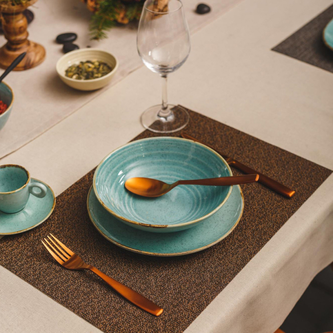 Hluboký talíř tyrkysové Gaya Sand s hnědým okrajem je specifický osobitým a uměleckým vzhledem, inspirovaný přírodními barvami. Deska byla vyrobena z odolného porcelánu Fine China v tyrkysové barvě a lesklého vzhledu o průměru 28 cm. Tyrkysová deska Gaya Sand je vhodná do průmyslových myček a mikrovln.