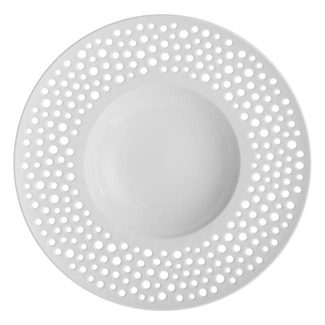 Deska s hlubokým průtokem s perforovaným okrajem byla vyrobena z kvalitního bílého porcelánu Fine China o průměru 23,5 cm. Jemný porcelán China je odolný a navržený pro každodenní použití v provozu. Hluboká perforovaná průtoková deska je vhodná pro průmyslové myčky nádobí a mikrovlny.
