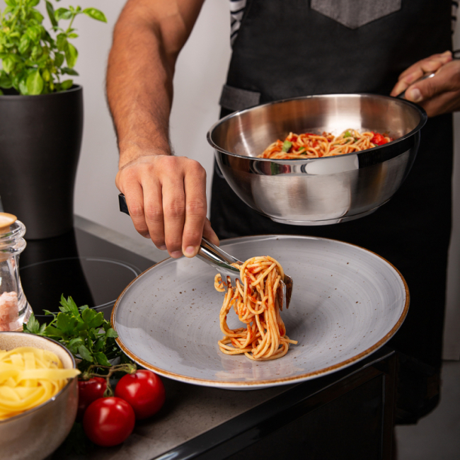 Univerzální šedá hluboká deska je výjimečná díky ruční malbě vnitřních stěn, která přemění každý kus na nenapodobitelný originál. Udělá Váš provoz útulným a poskytne hostům estetický zážitek. Hodí se nejen na servírování polévek, ale i na různé druhy těstovin a kaší. Deska má průměr 23 cm a je vhodná jak do myčky, tak do mikrovlnné trouby.