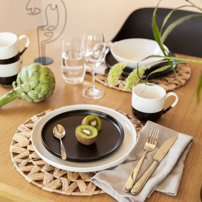 • Moderní mělká deska v černé barvě z řady Gaya nabízí široké využití. Například na servírování masových, zeleninových nebo rybích pokrmů. Je vyroben z porcelánu, má průměr 25 cm a je vhodný do myčky a mikrovlnné trouby.