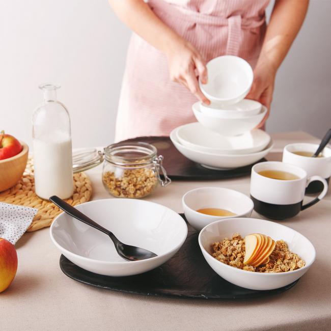 Mělká deska z linky Flow nabízí širokou škálu využití. Například na servírování masových, zeleninových nebo rybích pokrmů. Má průměr 28 cm a je vhodný jak do myčky, tak do mikrovlnné trouby.