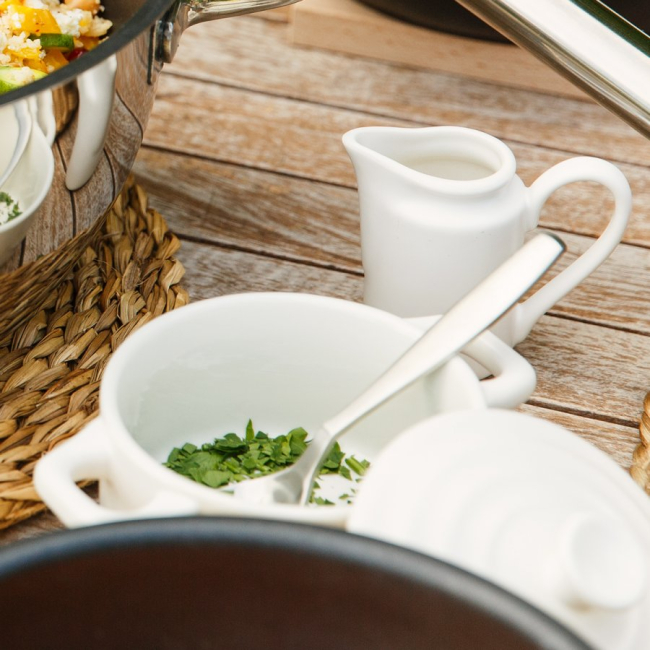 Výjimečný design porcelánového kastrolu s víkem z řady Gaya si zamilujete. Bílá barva a kombinace dvou různých povrchových úprav – lesklý uvnitř, matný venku dodá vašemu stolu prvky elegance, po kterých toužíte. Podávejte svá jídla stylově díky této nádobě.