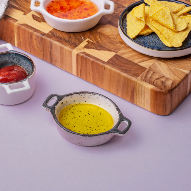 Zaujměte hosty ve svém podniku a podávejte jim omáčky nebo malé občerstvení v misce s neobvyklým okrajem, designovým vzorem a lesklým povrchem. Podávejte trendy a stylové.