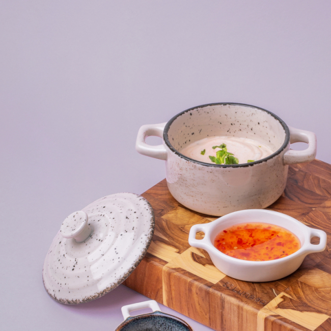 Zaujměte hosty ve svém podniku a podávejte jim omáčky nebo malé občerstvení v misce s neobvyklým okrajem, designovým vzorem a lesklým povrchem. Podávejte trendy a stylové.