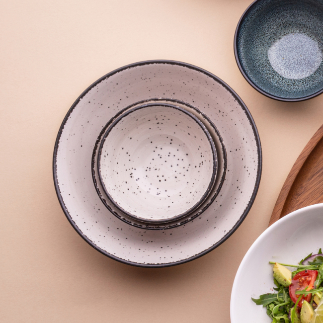 Zaujměte hosty ve svém podniku a podávejte jim předkrmy v misce s neobvyklým okrajem, designovým vzorem a lesklým povrchem. Podávejte trendy a stylové.
