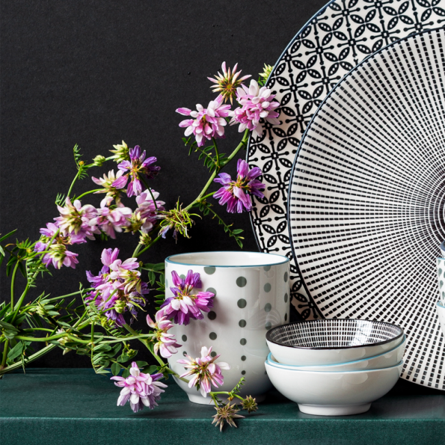 • S porcelánovou mísou z kolekce Elements Asia Wood se nápaditě ocitnete na dalekém východě. Jeho interiér tvoří ručně malovaný černobílý dekor. Skvělé je to například na servírování wasabi.