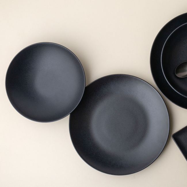 Základní mělké desky v matné černé barvě jsou vhodné zejména pro moderní gastro provozovny laděné v industriálním stylu. Díky jejich minimalistickému designu bude každé jídlo vypadat stylově a luxusně. Desky jsou vyrobeny z kameniny.