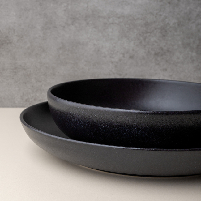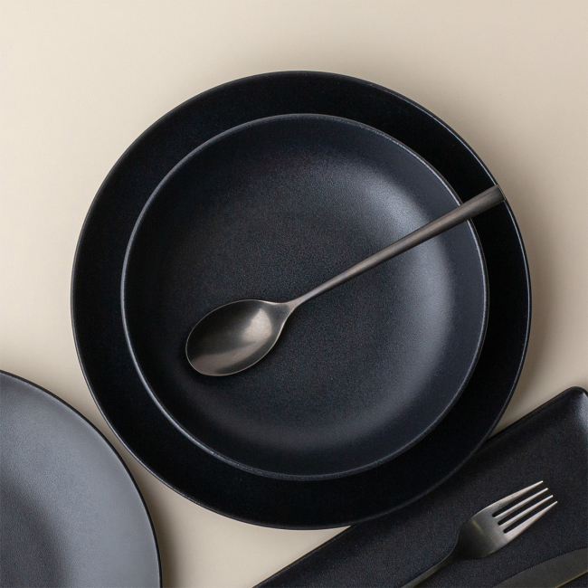 Základní mělké desky v matné černé barvě jsou vhodné zejména pro moderní gastro provozovny laděné v industriálním stylu. Díky jejich minimalistickému designu bude každé jídlo vypadat stylově a luxusně. Desky jsou vyrobeny z kameniny.