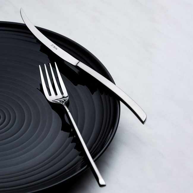 Event knife Avantgarde made of high quality chrome steel 18/0 with 7 mm. The knife handle is sandblasted. The event knife is suitable for industrial dishwashers. The Avantgarde product line was created by designer James Kawada and won several international awards.