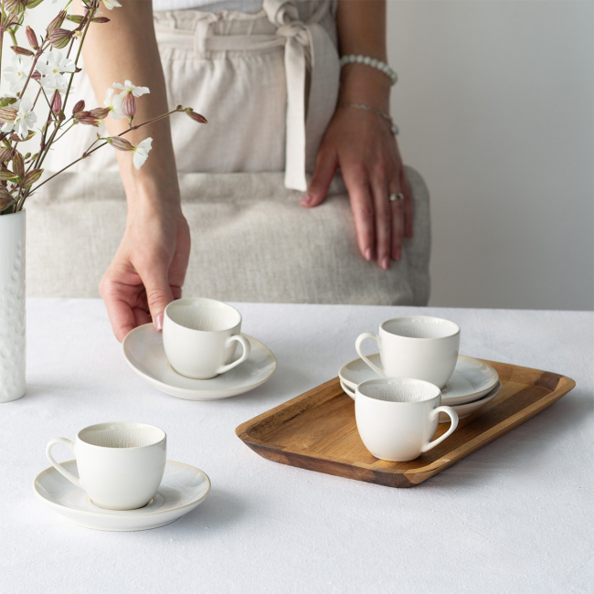 The coffee set in beige tones adds an elegant touch to coffee service. The glazed surface creates natural colour transitions, making each piece unique and allowing slight variations in shade or pattern. Ideal for cafés, restaurants and hotels. Dishwasher safe.